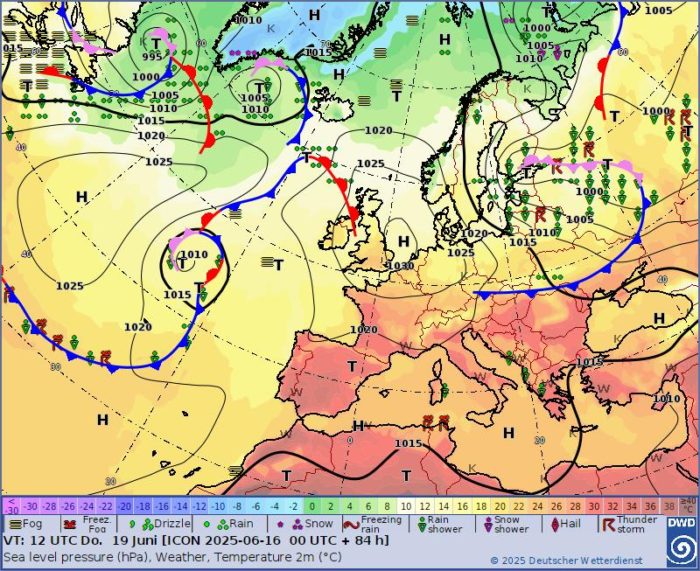 Obr. 5: Predpoveď synoptickej situácie na štvrtok, 19. júna. Zdroj: DWD