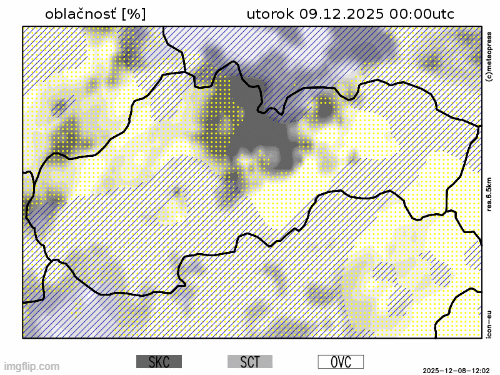 Obr. 2: Predpokladaný vývoj oblačnosti na Slovensku v utorok (9. 12.) podľa modelu ICON