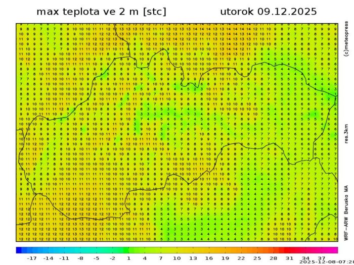 Obr. 4: Predpokladané maximálne teploty vzduchu v utorok (9. 12.) podľa modelu WRF