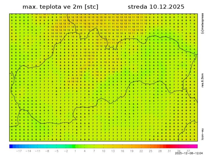 Obr. 7: Predpokladané maximálne teploty vzduchu v stredu (10. 12.) podľa modelu ICON