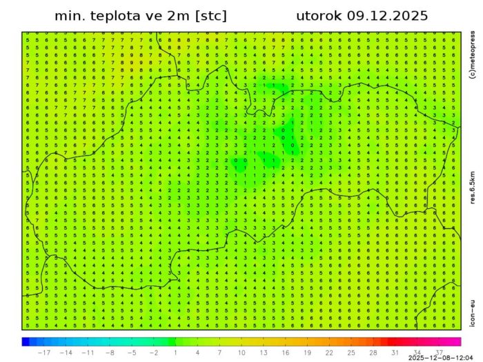 Obr. 3: Predpokladané minimálne teploty vzduchu v utorok (9. 12.) podľa modelu ICON