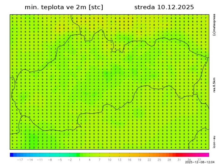 Obr. 6: Predpokladané minimálne teploty vzduchu v stredu (10. 12.) podľa modelu ICON