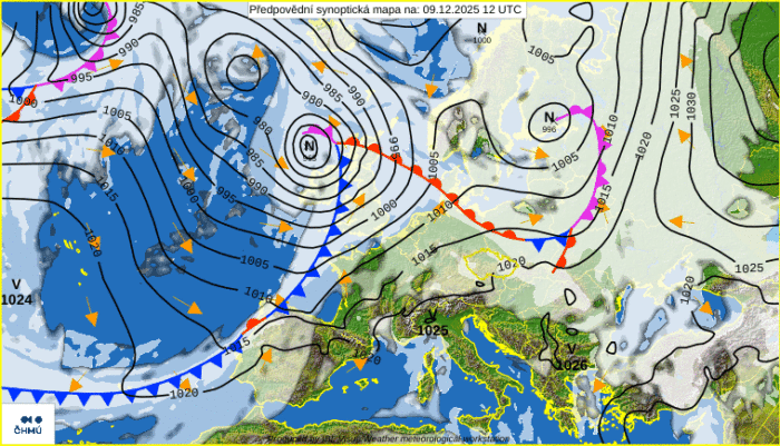 Obr.1: Synoptická situácia – utorok (9. 12.)