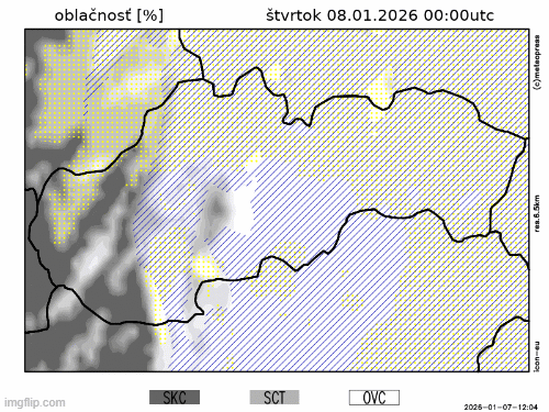 Obr. 2: Predpokladaný vývoj oblačnosti na Slovensku vo štvrtok (8. 1.) podľa modelu ICON