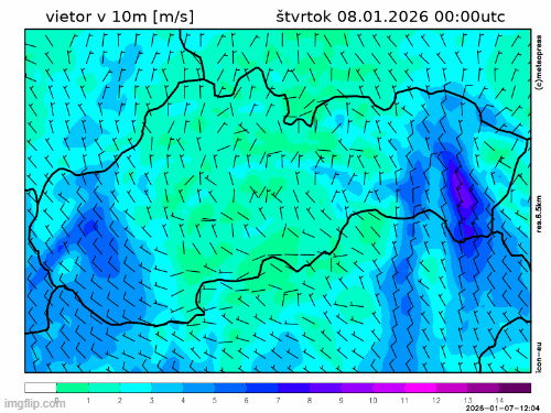 Obr. 4: Predpokladaný vývoj smeru a rýchlosti vetra na Slovensku vo štvrtok (8. 1.) podľa modelu ICON