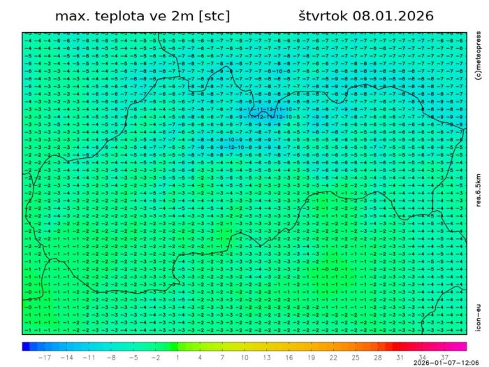 Obr. 6: Predpokladané maximálne teploty vzduchu vo štvrtok (8. 1.) podľa modelu ICON