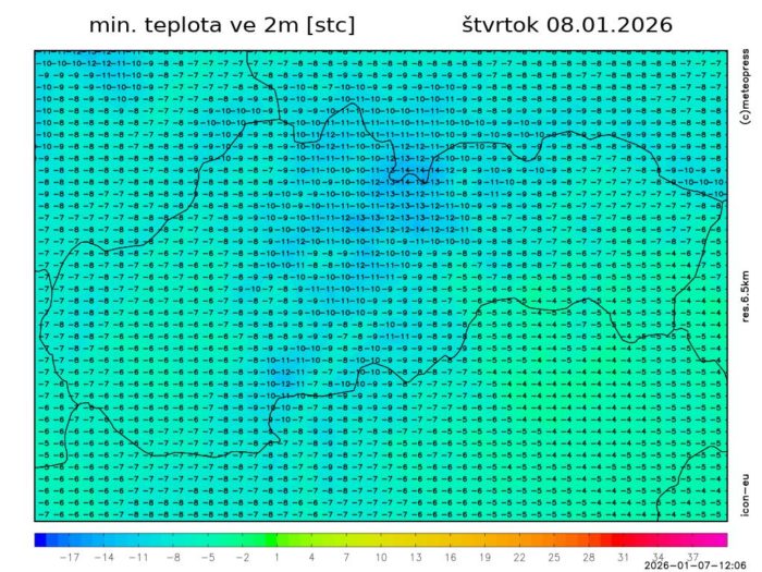 Obr. 5: Predpokladané minimálne teploty vzduchu vo štvrtok (8. 1.) podľa modelu ICON