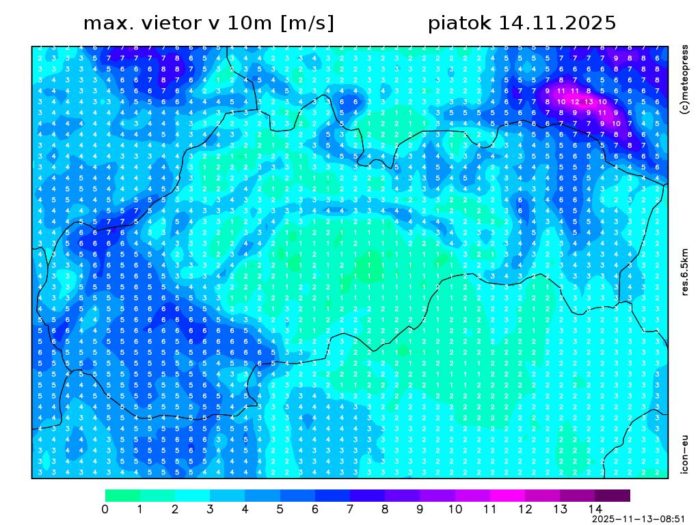 Obr. 3: Predpokladaná maximálna rýchlosť vetra na Slovensku v piatok (14. 11.) podľa modelu ICON-EU