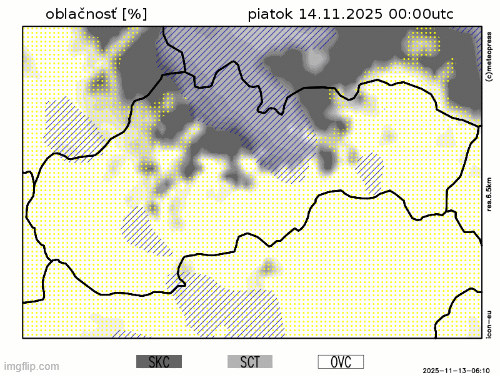 Obr. 2: Predpokladaný vývoj oblačnosti na Slovensku v piatok (14. 11.) podľa modelu ICON-EU