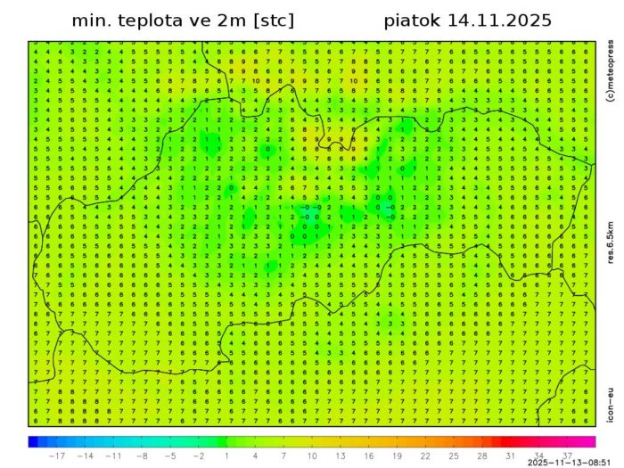 Obr. 4: Predpokladaná minimálna teplota vzduchu v piatok (14. 11.) podľa modelu ICON-EU