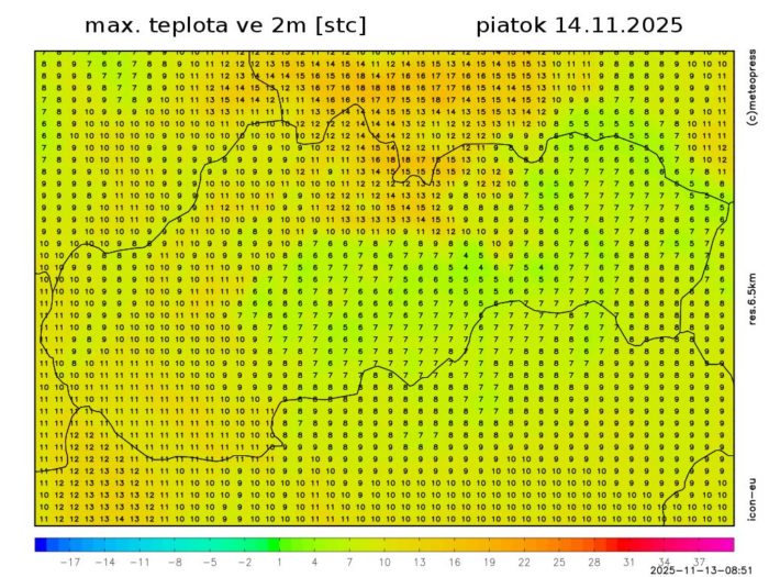 Obr. 5: Predpokladaná maximálna teplota vzduchu v piatok (14. 11.) podľa modelu ICON-EU