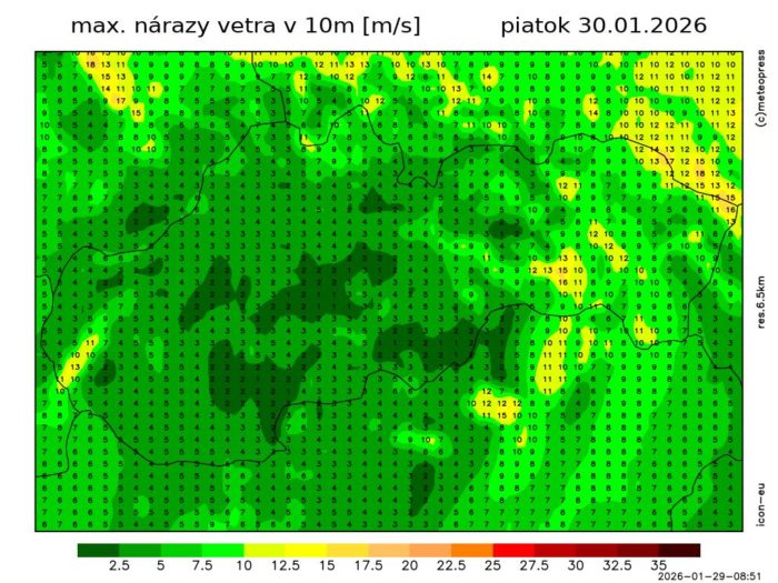 Obr. 4: Predpokladané maximálne nárazy vetra na Slovensku v piatok (30. 1.) podľa modelu ICON-EU