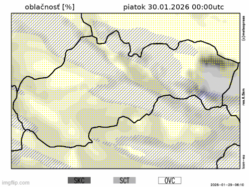 Obr. 2: Predpokladaný vývoj oblačnosti na Slovensku v piatok (30. 1.) podľa modelu ICON-EU