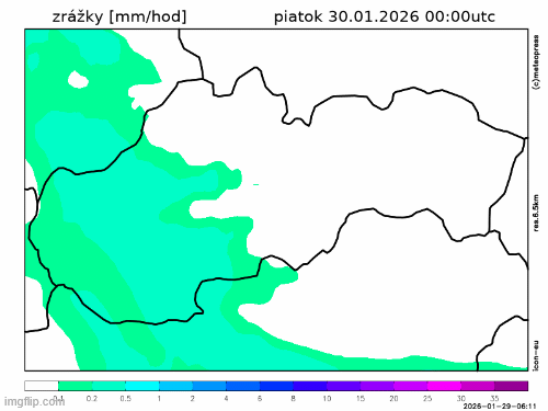 Obr. 3: Predpokladaný vývoj zrážok na Slovensku v piatok (30. 1.) podľa modelu ICON-EU