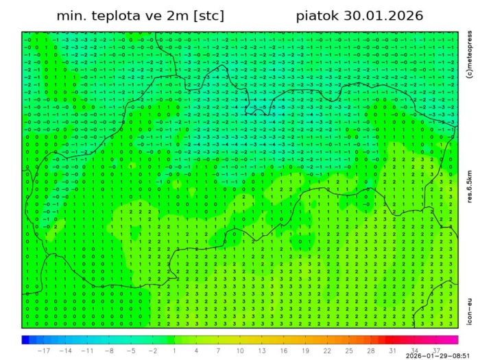 Obr. 5: Predpokladaná minimálna teplota vzduchu v piatok (30. 1.) podľa modelu ICON-EU