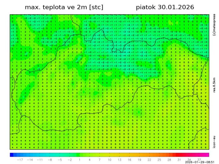 Obr. 6: Predpokladaná maximálna teplota vzduchu v piatok (30. 1.) podľa modelu ICON-EU