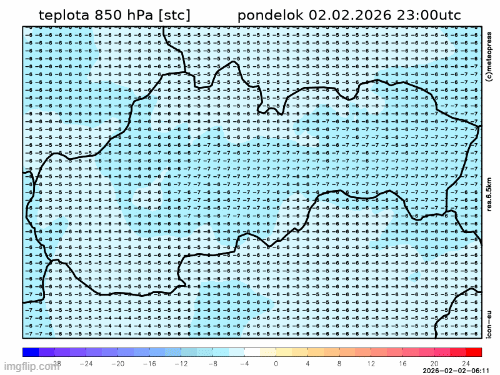 Obr. 3: Predpoveď teploty v hladine 850 hPa (približne 1500 m n. m.) podľa modelu ICON v období od utorka, 3. februára, do štvrtka, 5. februára dopoludnia.