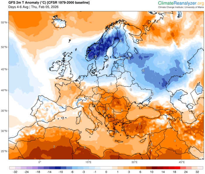 Obr. 7: Predpoveď anomálie teploty vzduchu v období 5.-7. februára oproti normálu rokov 1979-2000 podľa modelu GFS. Zdroj: climatereanalyzer.org