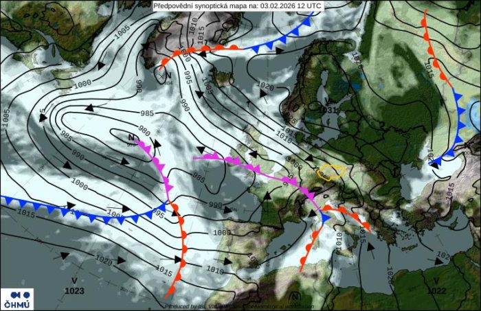 Obr. 1: Predpoveď synoptickej situácie utorok, 3. februára. Zdroj: ČHMÚ