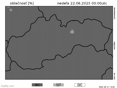 Obr. 2: Predpokladaný vývoj oblačnosti na Slovensku v nedeľu (22. 6.) podľa modelu ICON-EU