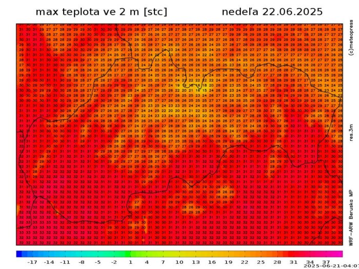Obr. 5: Predpokladaná maximálna teplota vzduchu v nedeľu (22. 6.) podľa modelu WRF