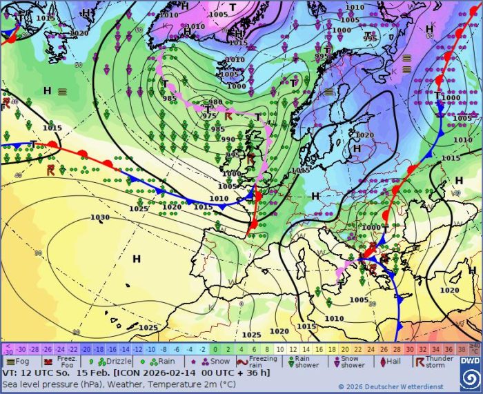 Obr. 1: Synoptická situácia – nedeľa (15. 2.)
