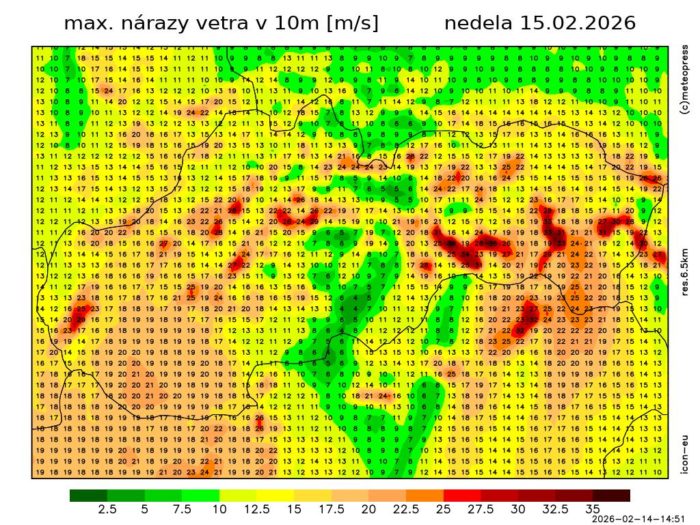 Obr. 4: Predpokladané maximálne nárazy vetra na Slovensku v nedeľu (15. 2.) podľa modelu ICON-EU