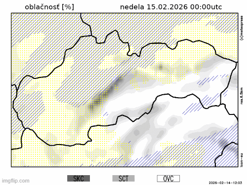 Obr. 2: Predpokladaný vývoj oblačnosti na Slovensku v nedeľu (15. 2.) podľa modelu ICON-EU