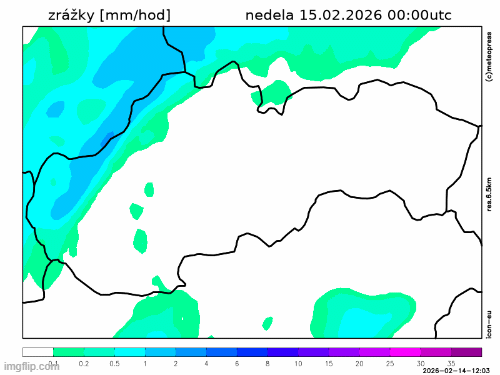 Obr. 3: Predpokladaný vývoj zrážok na Slovensku v nedeľu (15. 2.) podľa modelu ICON-EU