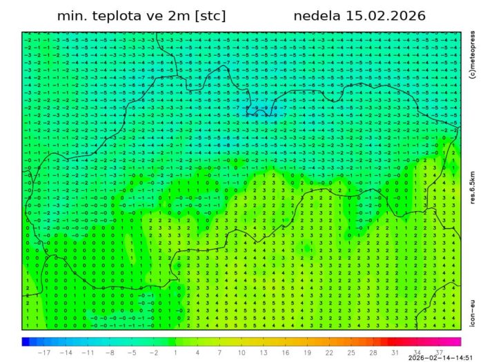 Obr. 5: Predpokladaná minimálna teplota vzduchu v nedeľu (15. 2.) podľa modelu ICON-EU