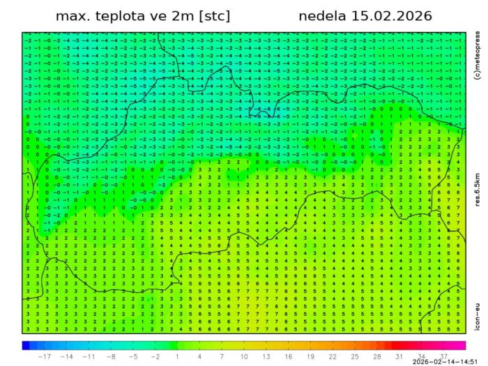 Obr. 6: Predpokladaná maximálna teplota vzduchu v nedeľu (15. 2.) podľa modelu ICON-EU