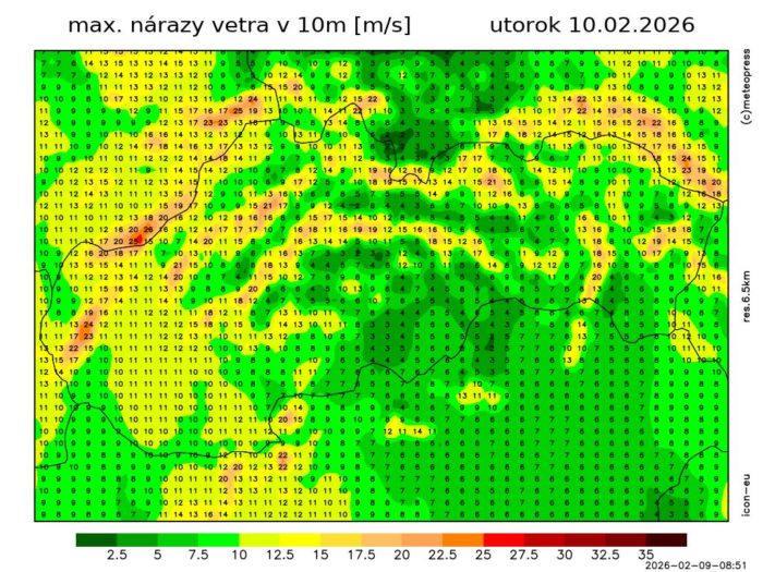 Obr. 4: Predpokladané maximálne nárazy vetra na Slovensku v utorok (10. 2.) podľa modelu ICON-EU