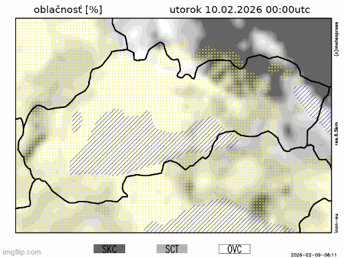 Obr. 2: Predpokladaný vývoj oblačnosti na Slovensku v utorok (10. 2.) podľa modelu ICON-EU