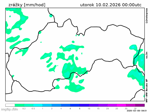 Obr. 3: Predpokladaný vývoj zrážok na Slovensku v utorok (10. 2.) podľa modelu WRF