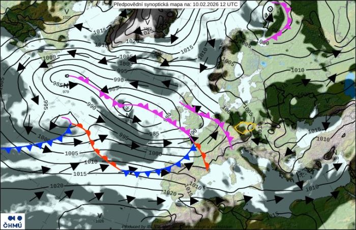 Obr. 1: Synoptická situácia – utorok (10. 2.)
