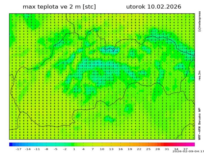 Obr. 6: Predpokladaná maximálna teplota vzduchu v utorok (10. 2.) podľa modelu WRF