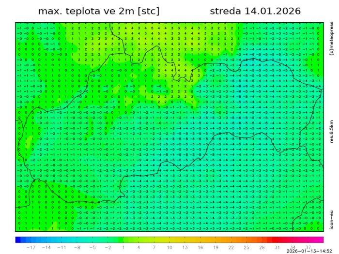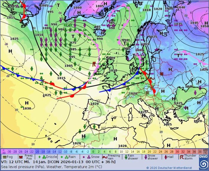 Obr. 1 Synoptická analýza na stredu 14.1.2026. Zdroj: DWD.de