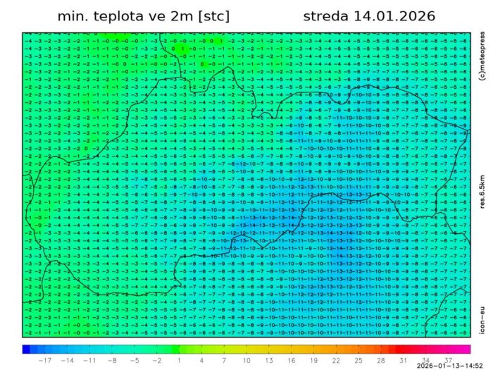 Nočná teplota -1 až -7, v Banskobystrickom kraji a na východe -8 až -14 °C.