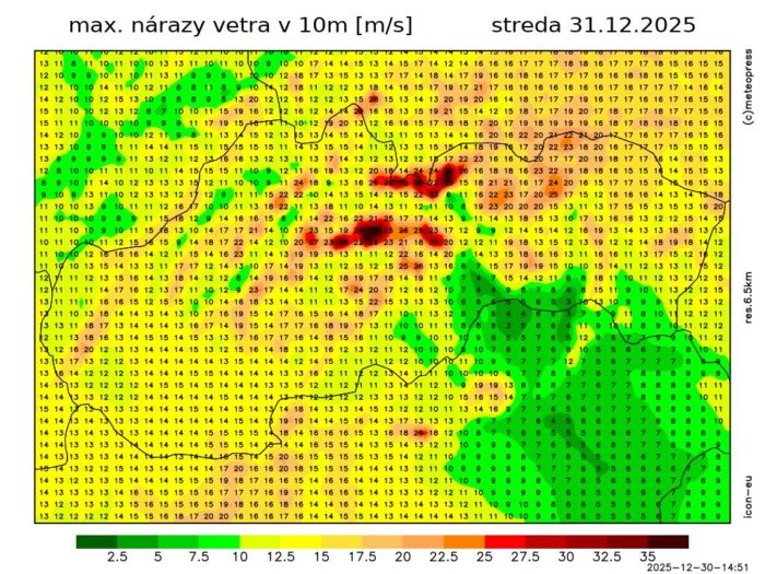 Obr. 4: Predpokladané maximálne nárazy vetra na Slovensku v stredu (31. 12.) podľa modelu ICON-EU