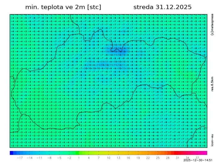 Obr. 5: Predpokladaná minimálna teplota vzduchu v stredu (31. 12.) podľa modelu ICON-EU
