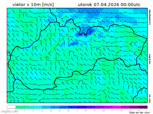 Obr. 3: Predpokladaný vývoj smeru a rýchlosti vetra na Slovensku v utorok (7. 4.) podľa modelu ICON