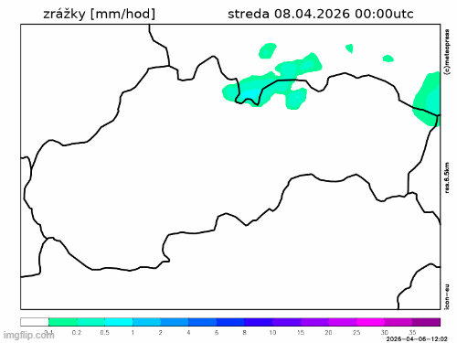 Obr. 6: Predpokladaný vývoj zrážkovej činnosti na Slovensku v stredu (8. 4.) podľa modelu ICON