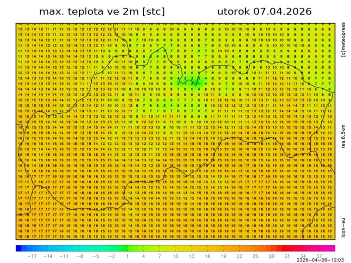 Obr. 5: Predpokladané maximálne teploty vzduchu v utorok (7. 4.) podľa modelu ICON