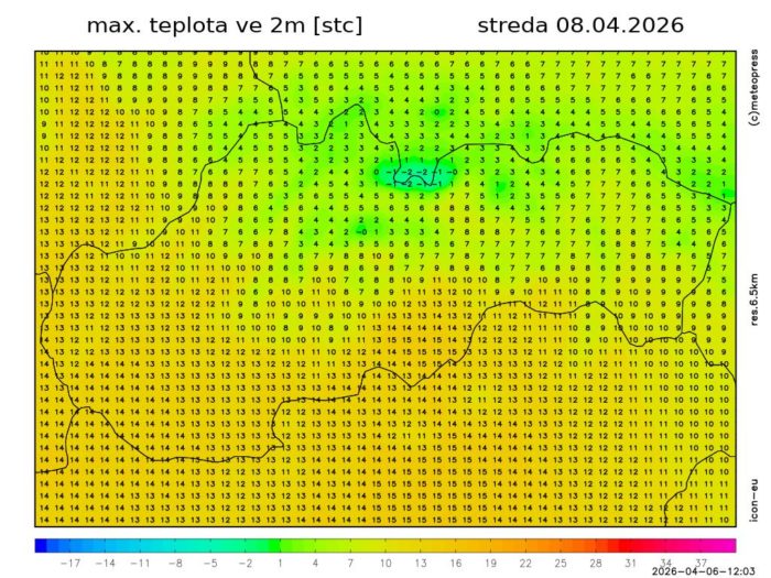 Obr. 9: Predpokladané maximálne teploty vzduchu v stredu (8. 4.) podľa modelu ICON