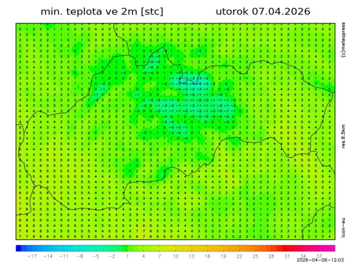 Obr. 4: Predpokladané minimálne teploty vzduchu v utorok (7. 4.) podľa modelu ICON