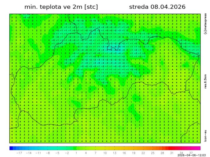Obr. 7: Predpokladané minimálne teploty vzduchu v stredu (8. 4.) podľa modelu ICON