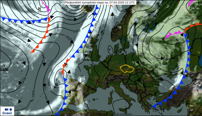 Obr. 1: Predpoveď synoptickej situácie na utorok (7.4.).
