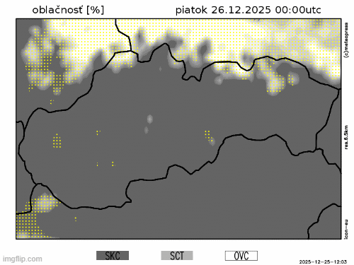 Obr. 1: Predpokladaný vývoj oblačnosti na Slovensku v piatok (26. 12.) podľa modelu ICON