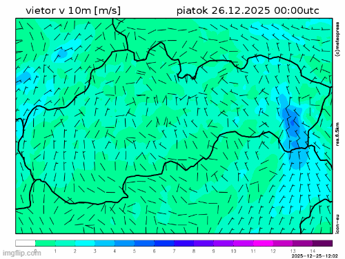 Obr. 2: Predpokladaný vývoj smeru a rýchlosti vetra na Slovensku v piatok (26. 12.) podľa modelu ICON
