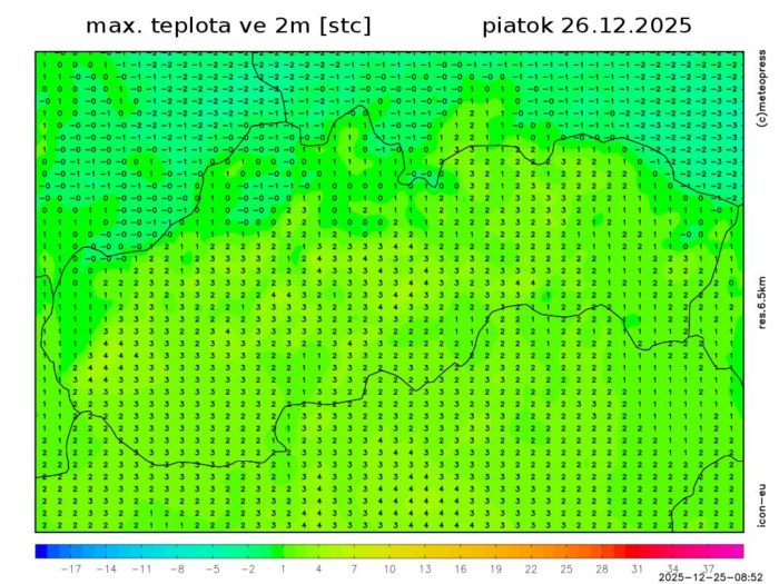 Obr. 4: Predpokladané maximálne teploty vzduchu v piatok (26. 12.) podľa modelu ICON